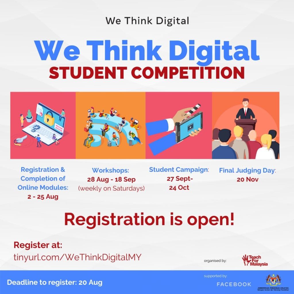 Eligibility : Open to all Malaysian students aged 13 – 17 years old. Students must sign up as a team of 5, plus 1 teacher from the same school. Students must have stable internet connection. Students must have a mobile device (ideally laptop/computer) that supports Google Slides, Google Classroom, and Zoom
